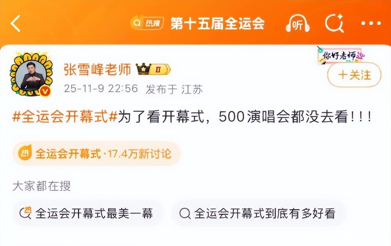 此前他在微博公开表示,为了观看全运会开幕式,主动放弃这场演出机会。