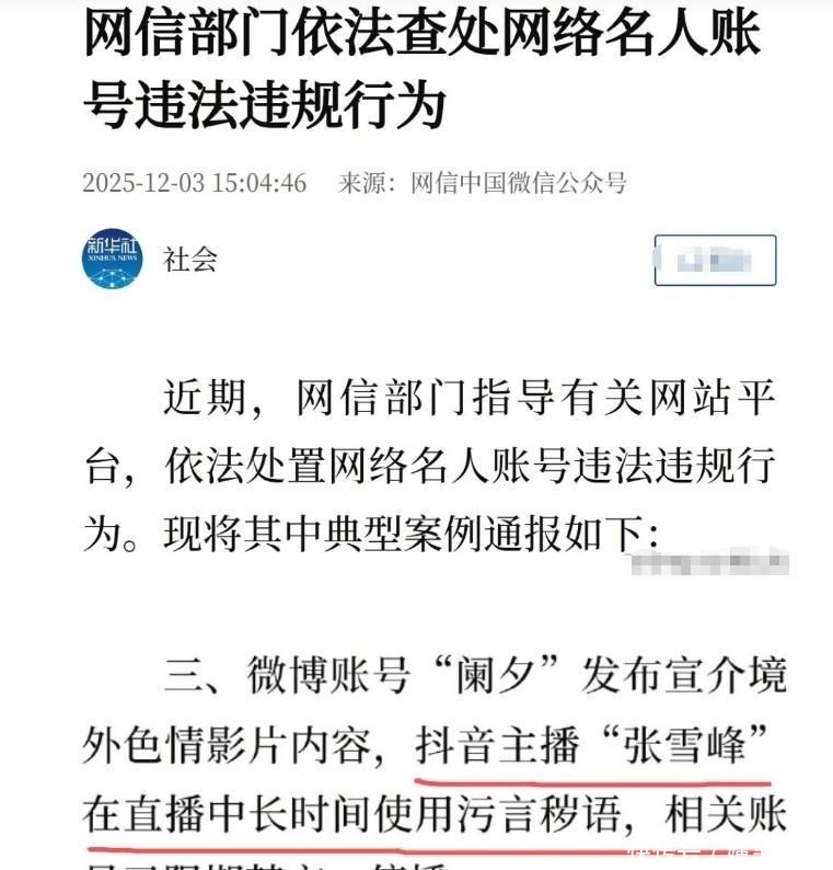 官方明确将张雪峰列为典型案例之一,指出其在抖音直播期间长期使用低俗粗鄙语言,决定对其相关账号实施限期禁言及暂停直播权限。